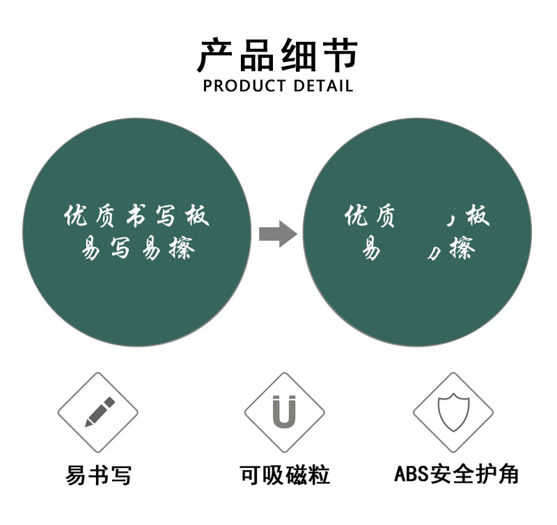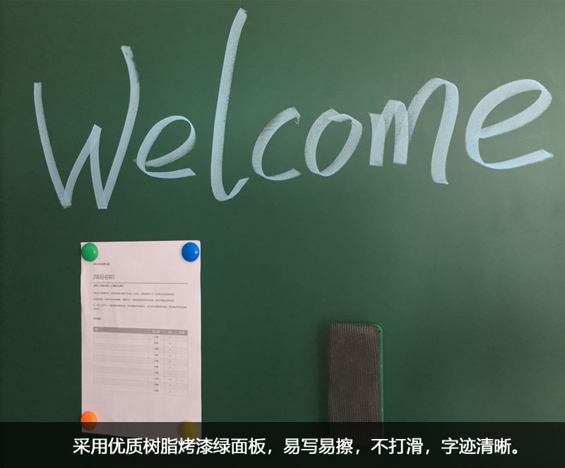 2、面板:树脂烤漆绿面板,厚度≥0.27mm,板面经过双面双涂处理,书写流畅,易写易擦,适用于无尘粉笔。