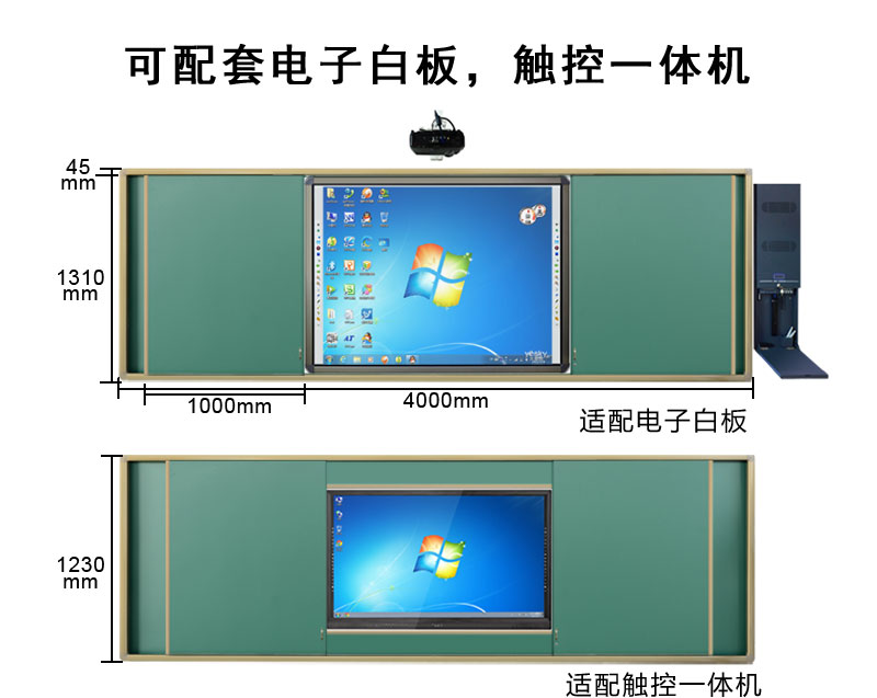 1、整体尺寸:约4000*1230mm;固定绿板:约1004*1200*2件;移动绿板:约1004*1188*2件,可根据实际教室大小定做。