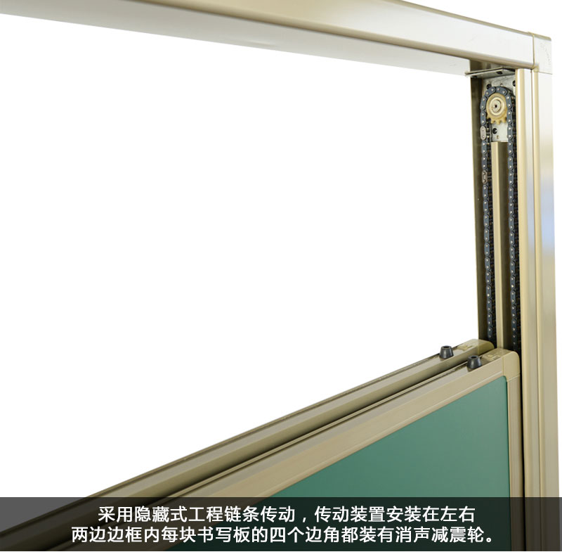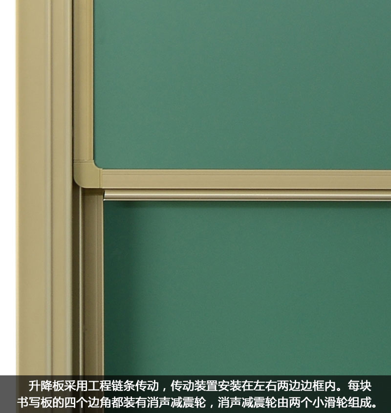 每块书写板的四个边角都装有消声减震轮,消声减震轮由两个小滑轮组成。